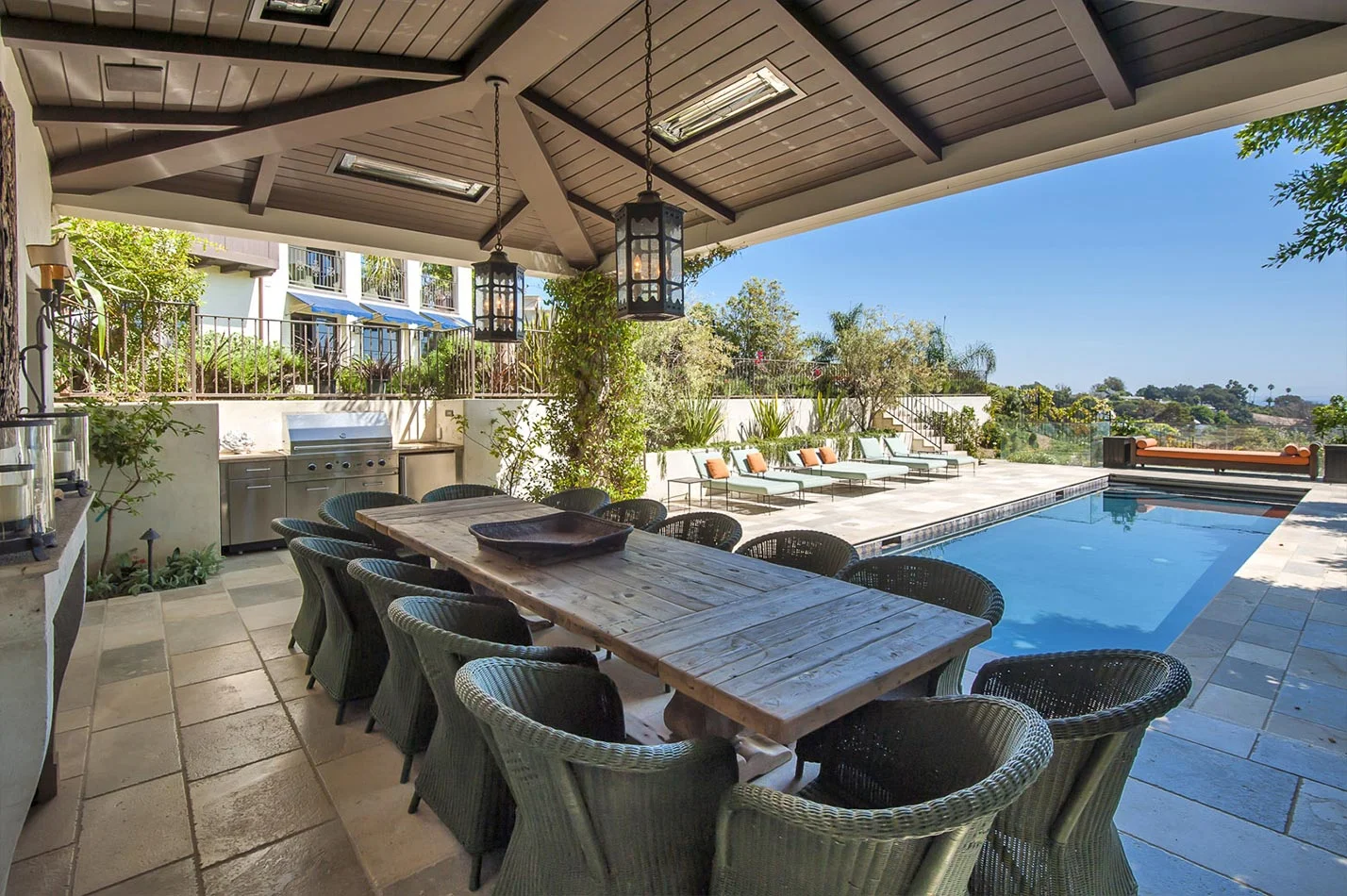 Some people like to swim more than others and, after building an access road from lower Paseo up the side of the cliffs, an infinity pool was born, complete with an outdoor dining pavilion overlooking the Pacific Ocean. While this project originally concentrated on the exterior vision, DGC, in conjunction with former partner Brunsell Construction, also remodeled the upper levels of this three-story home, the basement level—installing a state-of-the-art movie theater, reception lounge, and home gym—as well as building a new office in the service quarters.